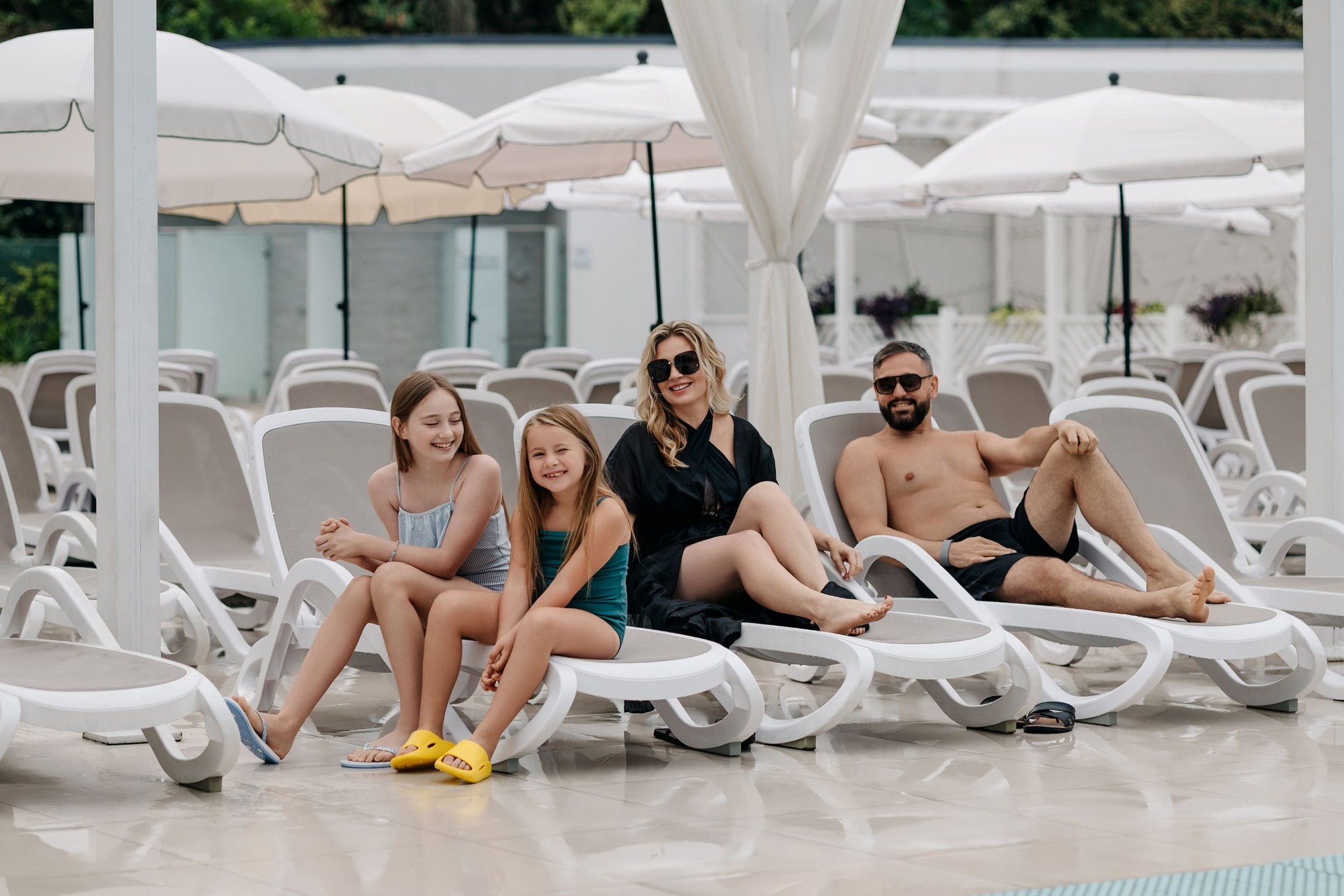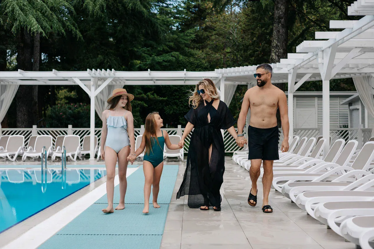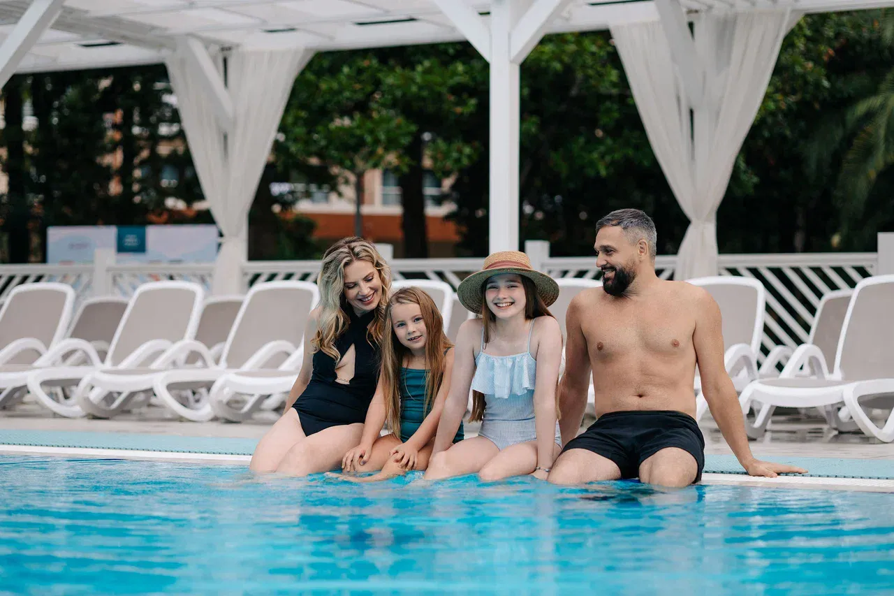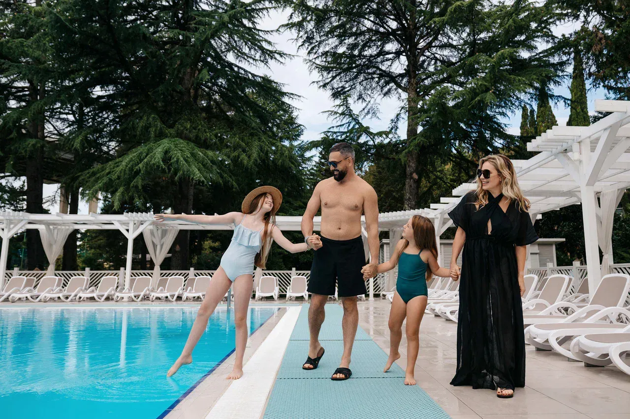 Круглогодично в плавательном бассейне поддерживается температура +26 - 28 °C, что позволяет не отказываться от водных процедур даже зимой. Для удобства гостей вокруг бассейнов расположены шезлонги с замечательным видом.