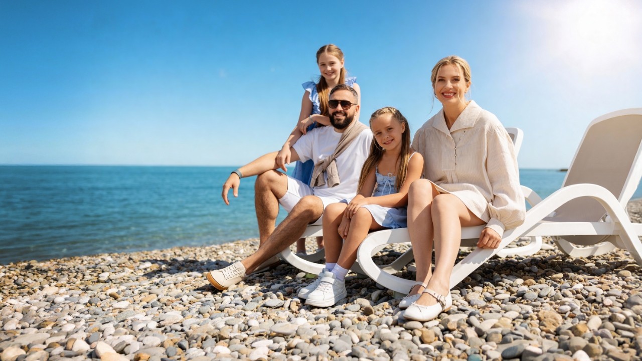 Собственный галечный пляж Alean Family Sputnik находится на территории курорта и имеет все необходимое для комфортного отдыха на берегу Черного моря.