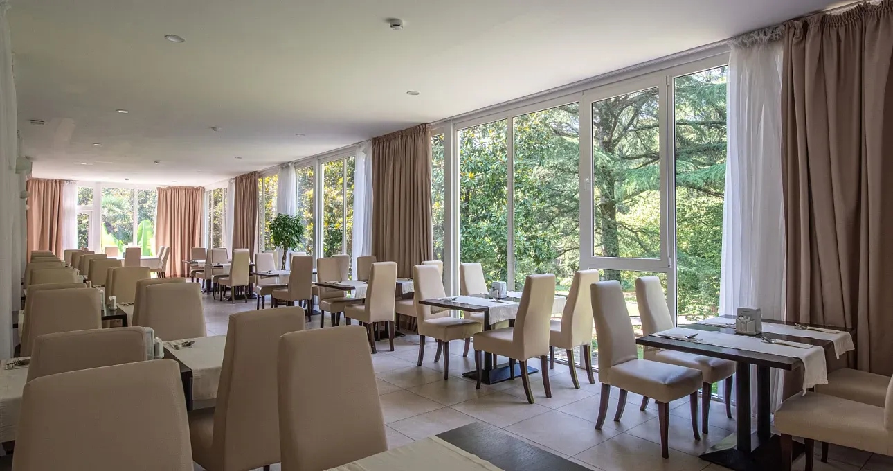 Два светлых и просторных зала ресторана, оформленные в итальянском стиле, отличаются с одной стороны простотой, с другой – изыском. В отделке интерьера применяются натуральные материалы, что подчеркивает единение с природой и вписывается в общую концепцию курорта.