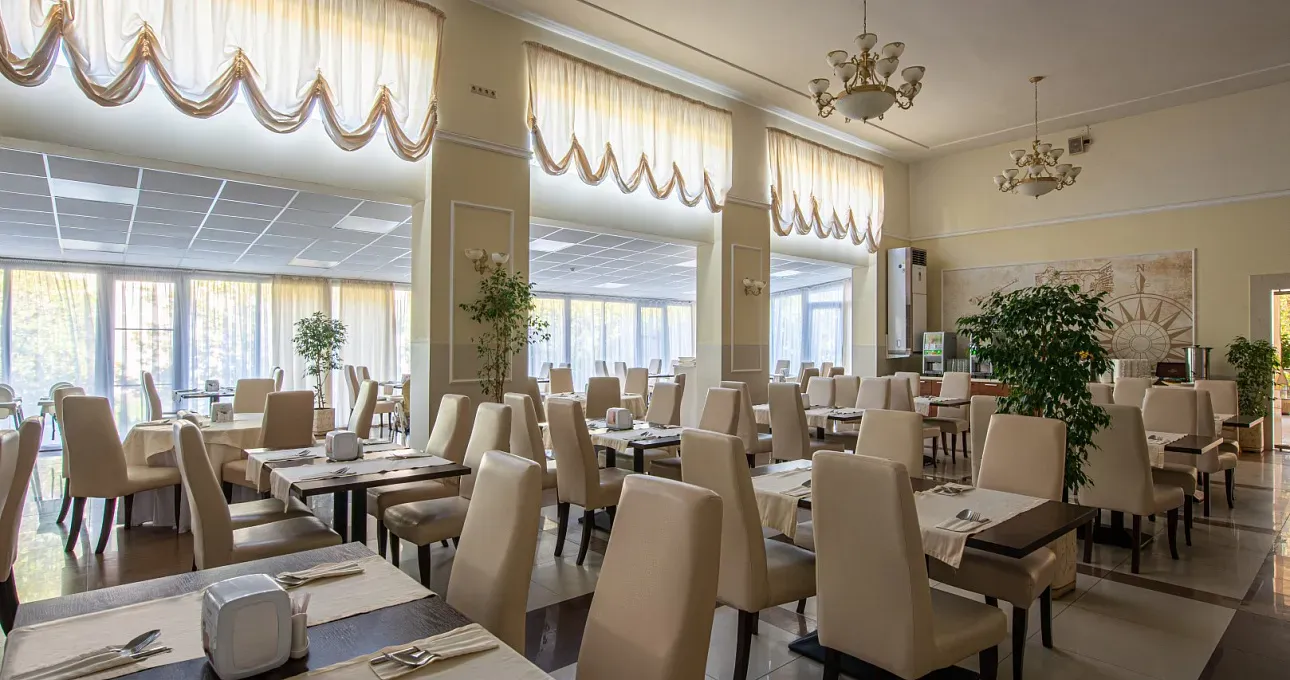 Два светлых и просторных зала ресторана, оформленные в итальянском стиле, отличаются с одной стороны простотой, с другой – изыском. В отделке интерьера применяются натуральные материалы, что подчеркивает единение с природой и вписывается в общую концепцию курорта.