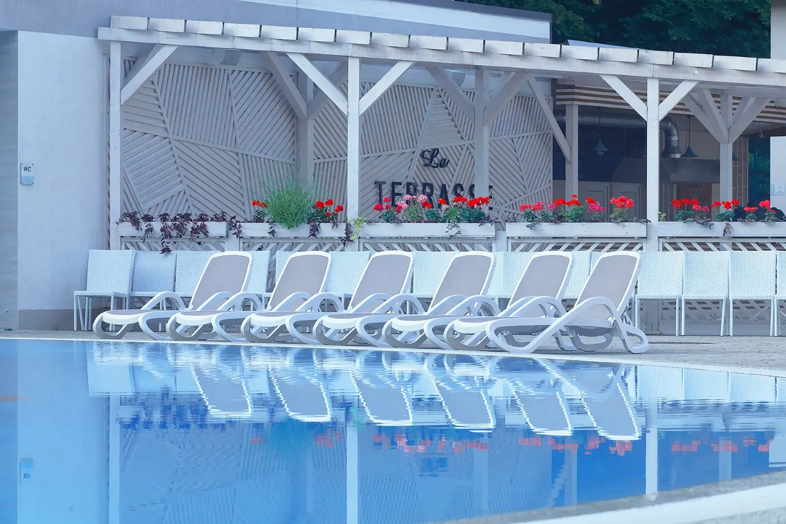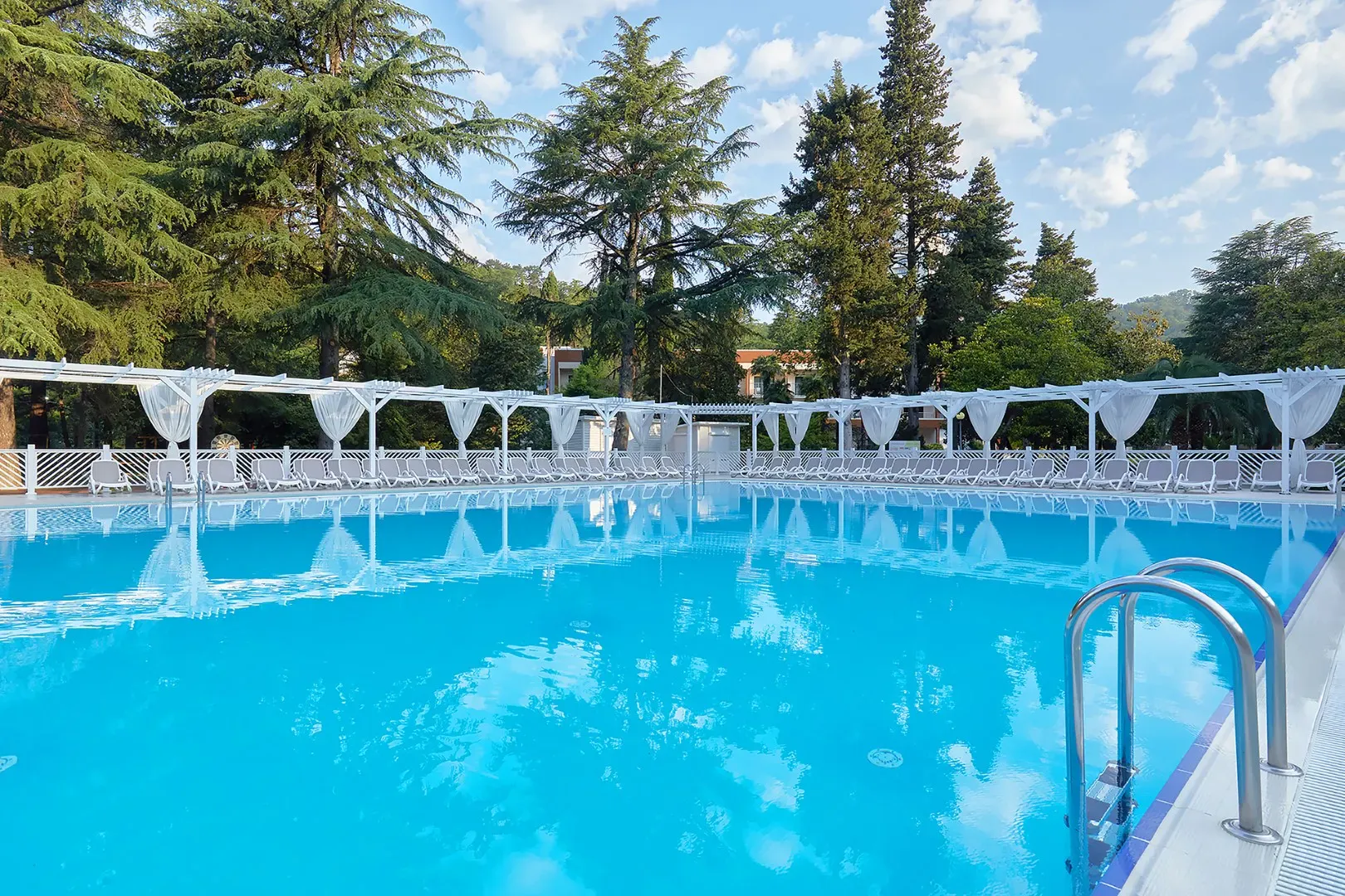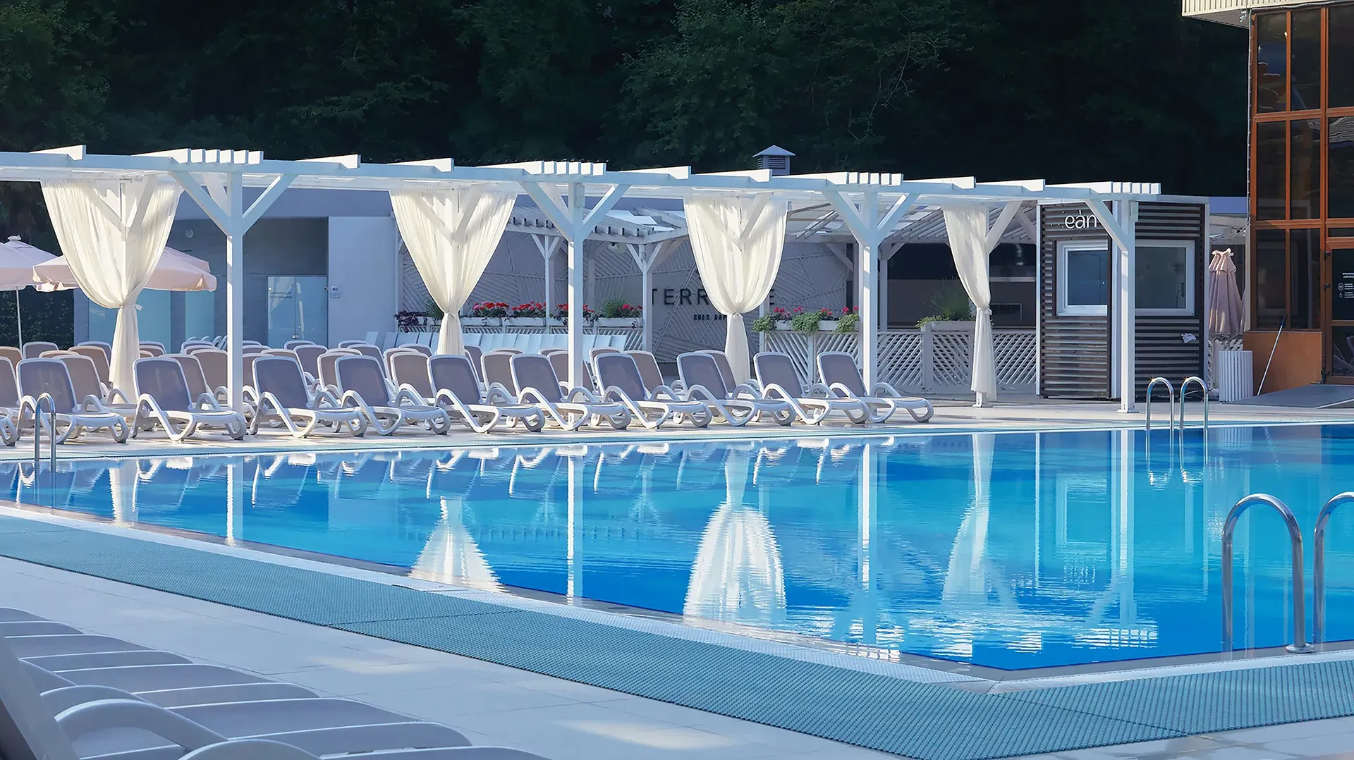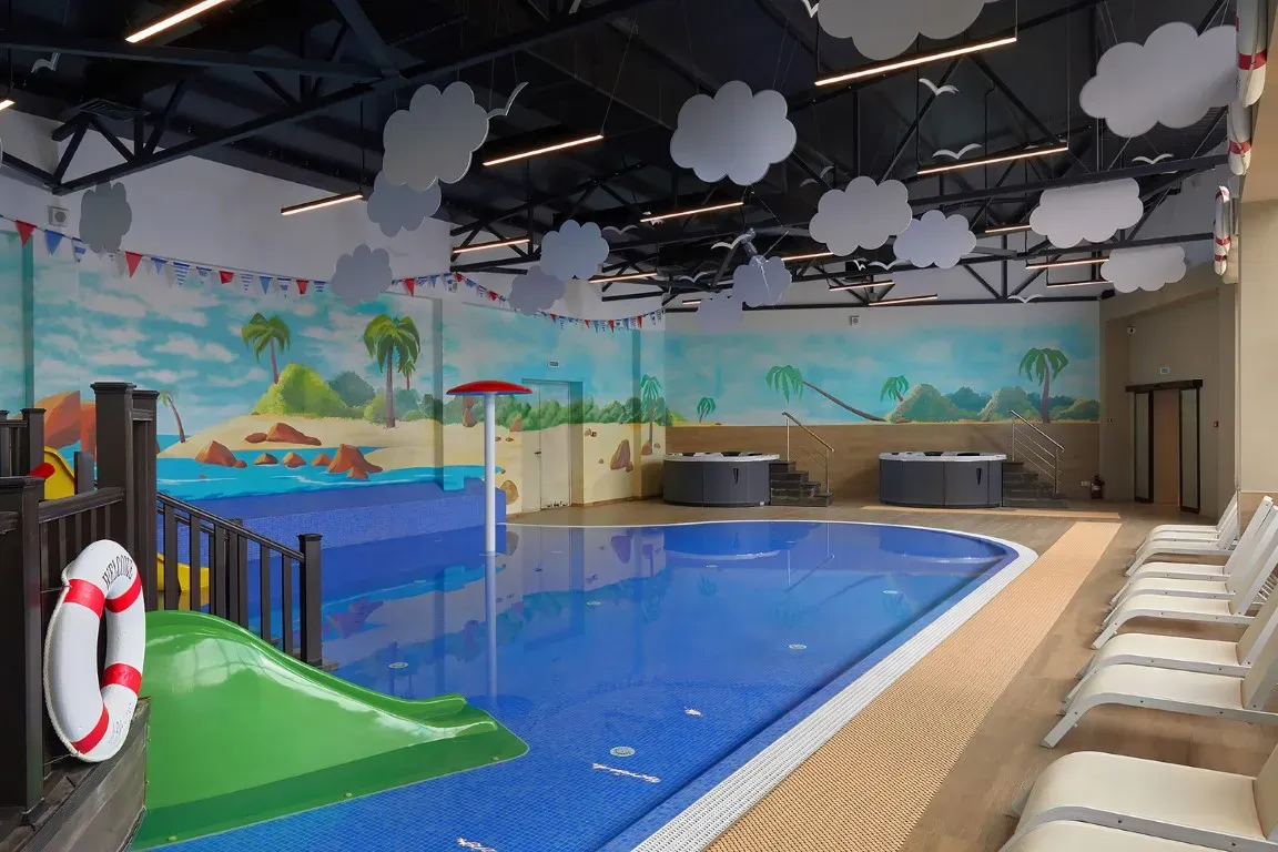 Круглогодично в нем поддерживается температура +25 - +27 C, что позволяет не отказываться от водных процедур даже зимой. Бассейн оснащен каскадным водопадом, противотоками и гидромассажем.