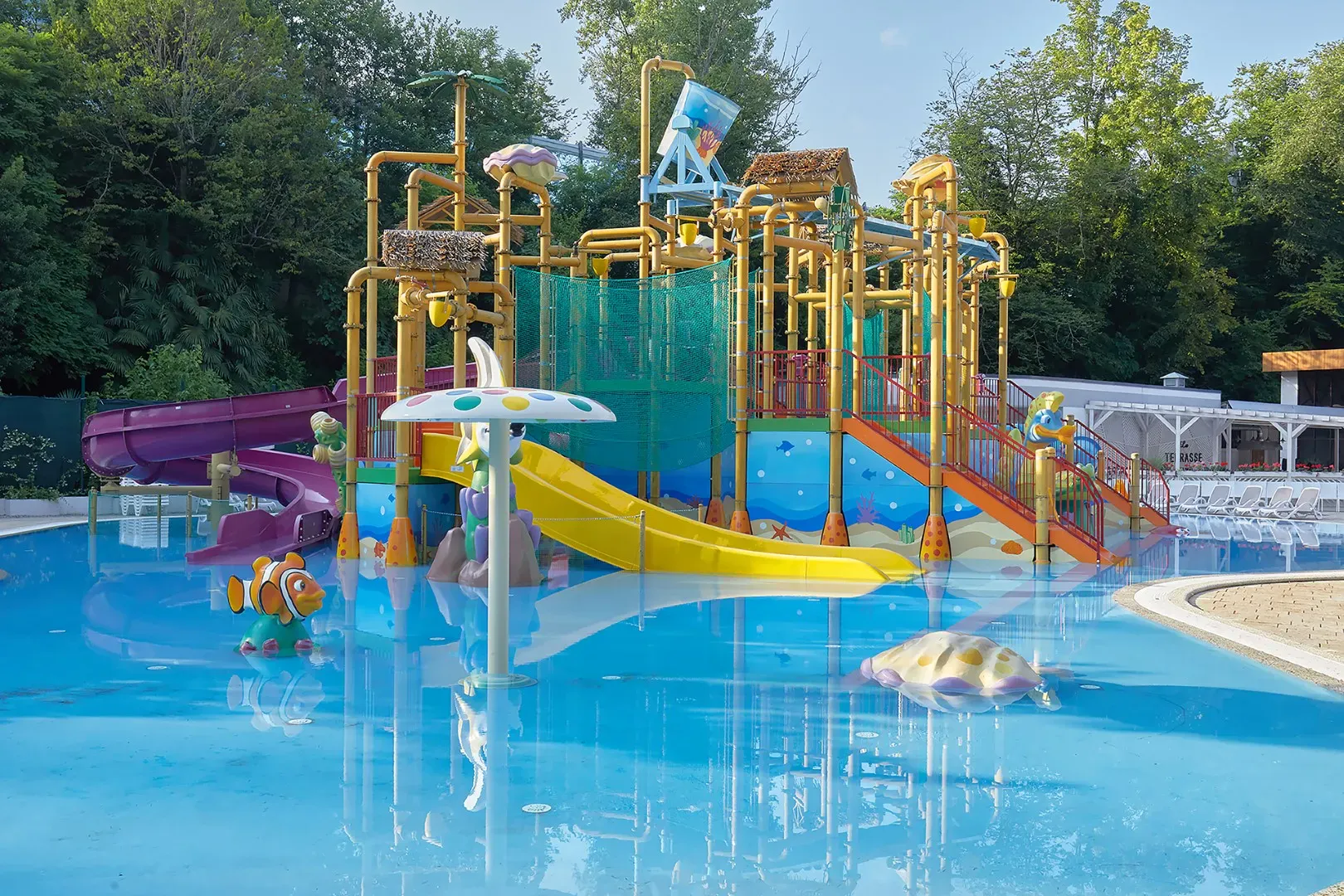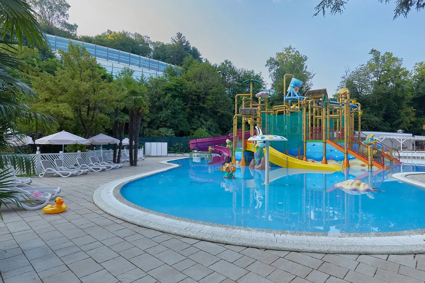 На обширной территории спа отеля расположен открытый подогреваемый бассейн, детский аквапарк и крытый бассейн с водными горками.