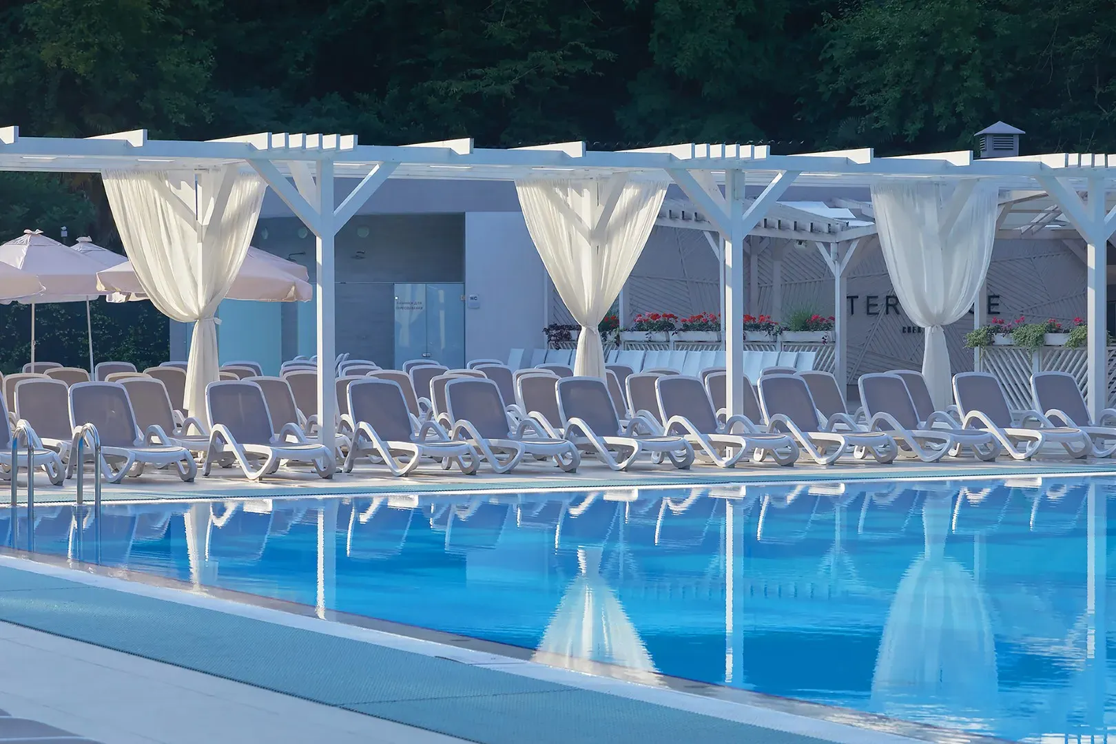 Открытый подогреваемый бассейн (S-205 м2, длина дорожки 25 м, глубина-1,6 м);