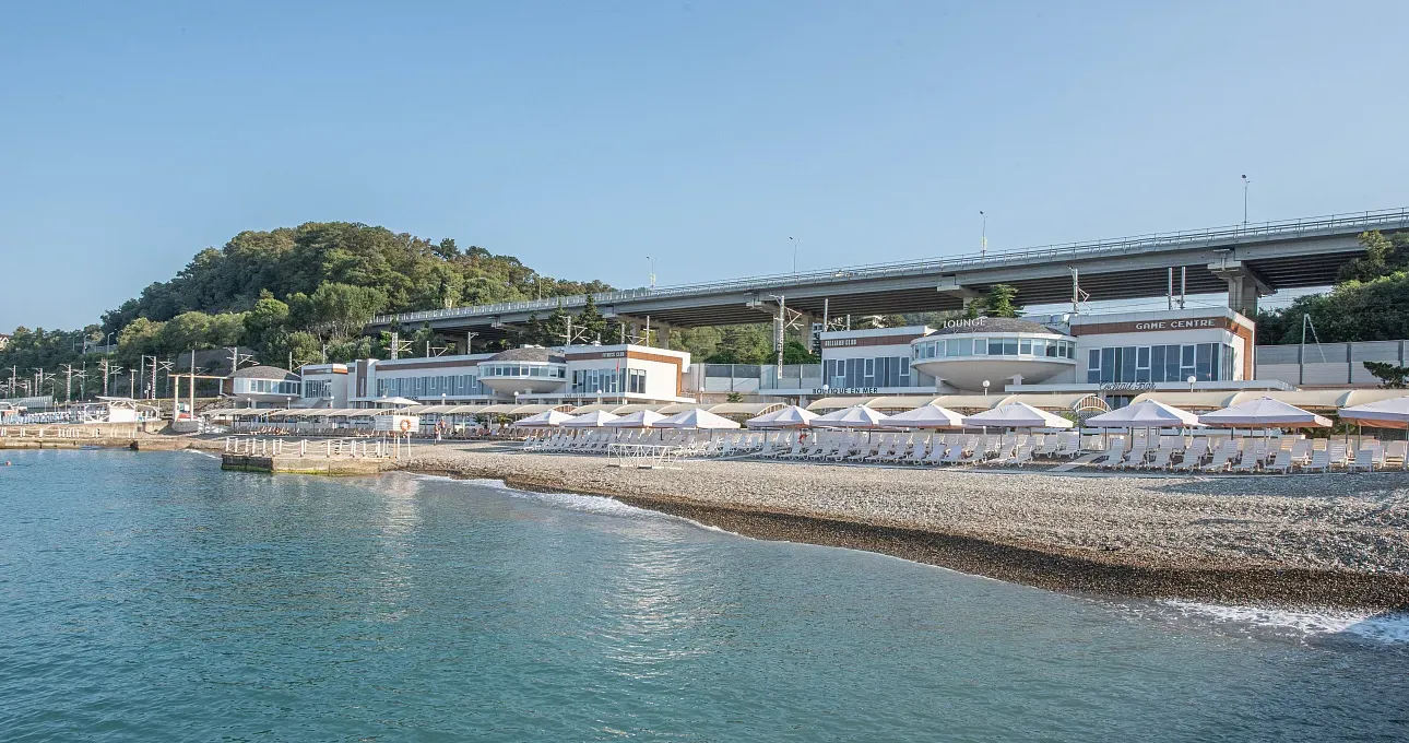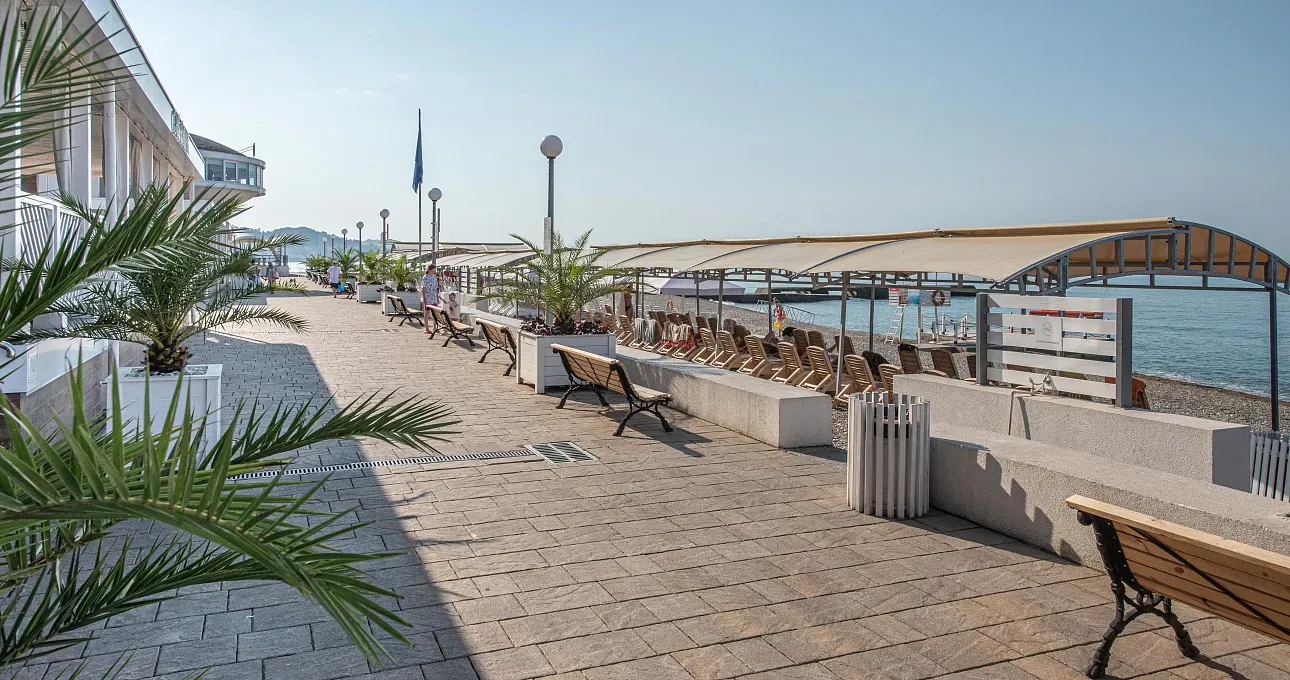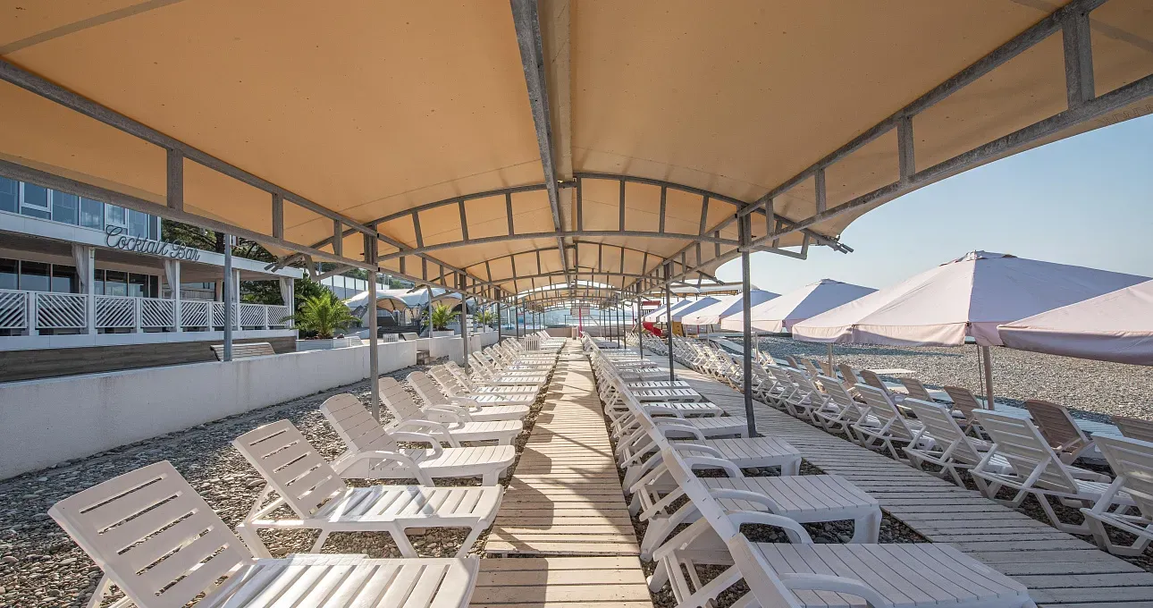 Собственный галечный пляж расположен на территории отеля в Сочи, где есть все необходимое для комфортного отдыха на берегу Черного моря.