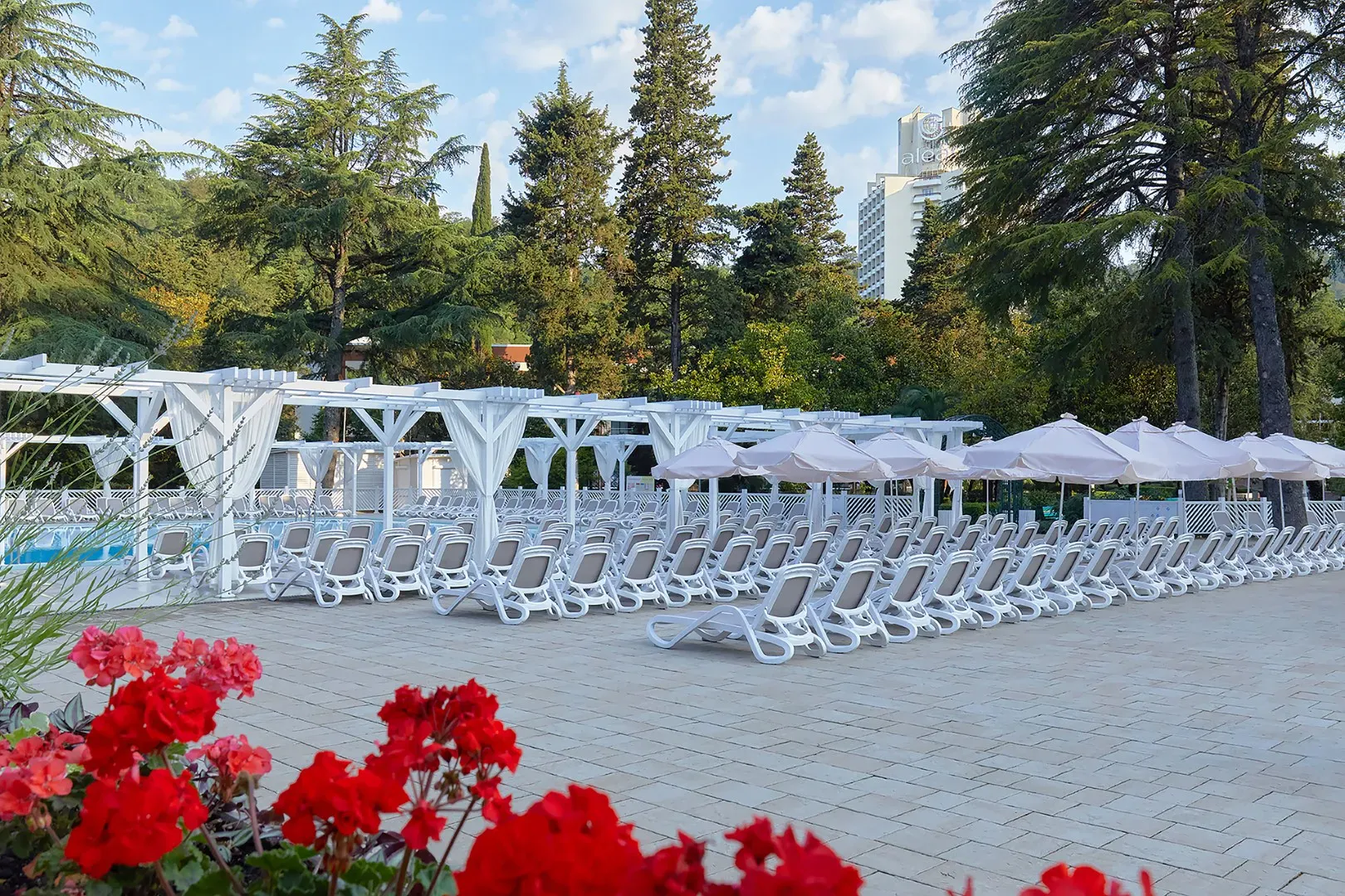 К услугам гостей собственный галечный пляж, оснащенный шезлонгами, зонтами, душевыми и раздевалками, а также открытый подогреваемый бассейн с постоянной температурой воды +25-27°C, что обеспечивает комфортное купание независимо от сезона.