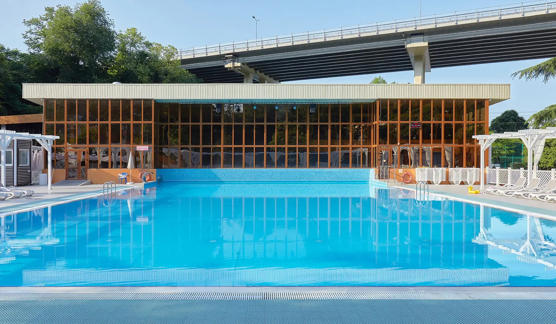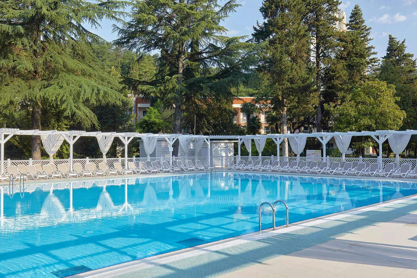 Круглогодично в плавательном бассейне поддерживается температура +26 - +28 C, что позволяет не отказываться от водных процедур даже зимой. Для удобства гостей вокруг бассейнов расположены шезлонги с замечательным видом.
