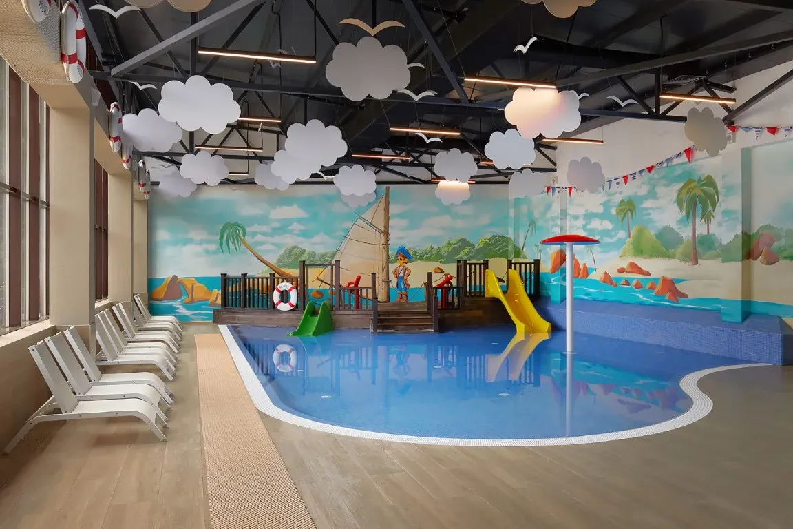 Для семей с детьми предусмотрены разнообразные развлечения: детские клубы для разных возрастов, анимационные программы, а также крытый детский бассейн с аквагорками, в стиле пиратского корабля.